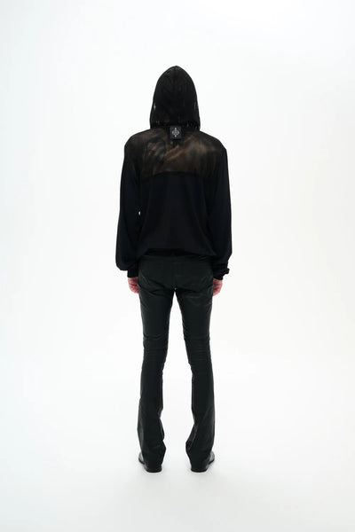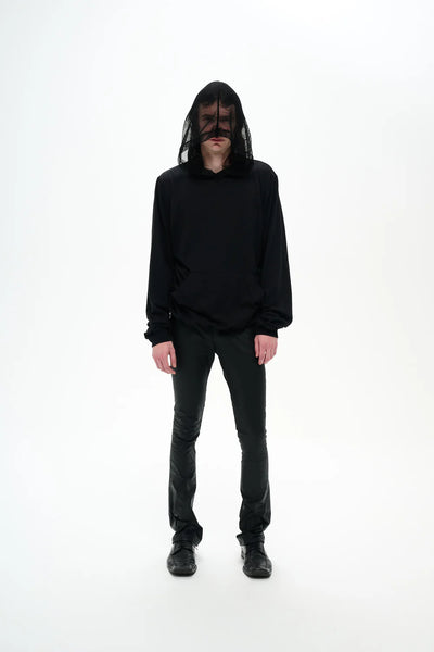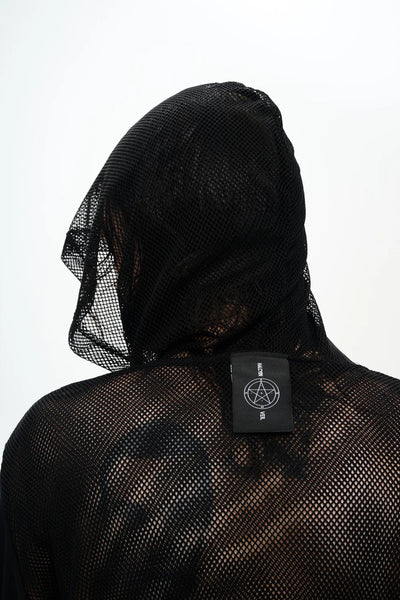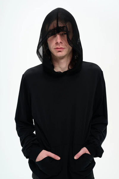 A limited collaboration between Danish brand P.L.N. and Halcyon Veil from the Snit collection. This long sleeve mesh hoodie features a regular fit with mesh hood construction and front pocket detail. Crafted from 100% cotton with synthetic mesh panels, it's made in the USA and available in black.